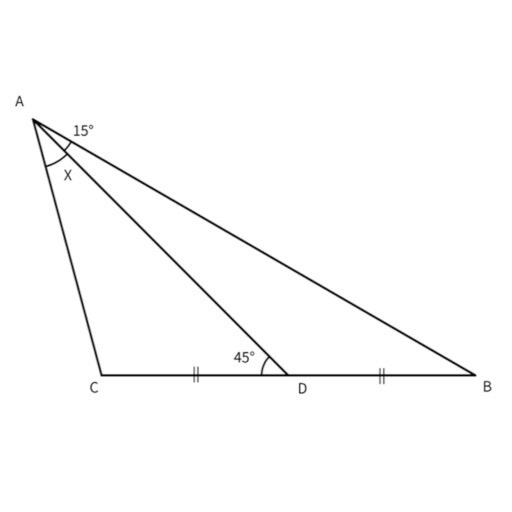 삼각형 ABC에서 선분 BC의 중점을 D라고 하자. ⦟BAD는 15°이며, ⦟ADC는 45°일 때, ⦟CAD의 크기를 구하시오.